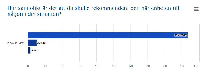 NPS-värde, Net Promoter Score, är andelen som svarat 9-10 (ambassadörer) minus andelen som svarat 0-6 (kritiker) på frågan. De som svarat 7-8 ingår ej i beräkningen (passiva). 0 = inte alls sannolikt och 10 = mycket troligt