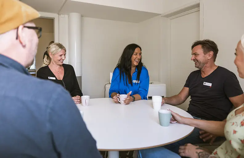 Du behöver vara samarbetsinriktad för att trivas här. Vi jobbar i team tillsammans med patienten. Teamet består av patienten själv, terapeuten, vår doktor och avdelningspersonalen och ska tillsammans bidra till att ha en gemensam bild av problematiken och fatta gemensamma beslut – om nästa steg, hur går vi vidare etc. Eftersom patienten bor på behandlingshemmet tillbringar hen merparten av sina timmar tillsammans med medpatienter och personal på avdelningen. Därför blir samarbetet med andra yrkeskategorier så viktigt, för att vi ska hålla samma röda tråd i arbetet med den enskilde patienten. Avdelningspersonalen är de som stöttar och arbetar med patientens svårigheter i det vardagliga, det som sker på avdelningen exempelvis i samband med måltider eller då patienten kämpar med att stå emot impulser av olika slag. Därför är det viktigt att vi är samspelta och drar åt samma håll.
