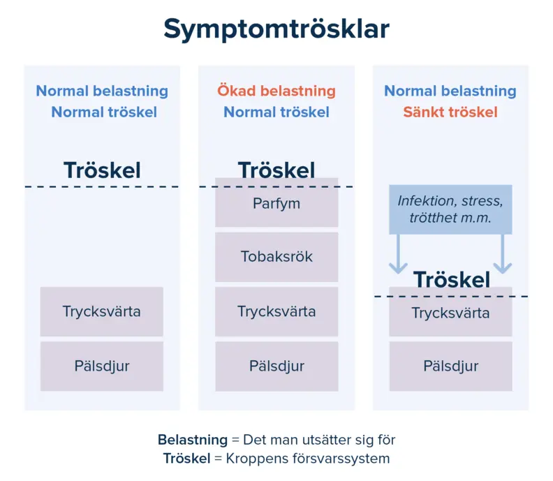 Om dessutom någon kommer in i köket och tänder en cigarett (detta var lite vanligare förr - men låt oss låtsas!). Då finns det ungefär 4000 olika kemiska ämnen i röken och en del av dem är mycket irriterande. Fortfarande har du en liten bit kvar till tröskeln, så du klarar dig utan besvär. Därefter kommer ytterligare en person in i rummet och har precis använt en starkt luktande parfym. Då blir det tillsammans för mycket och du får dina symptom. Ofta är det nu du kanske säger "jag tål inte parfym" - men egentligen är det kombinationen av katt, trycksvärta, tobaksrök och parfym som blev för mycket för dig. Det skulle då räcka med att EN av dessa orsaker togs bort, så hade du inte uppnått tröskeln och sluppit besvären. Med andra ord är det alltså den totala mängden allergiframkallande och irriterande ämnen som är avgörande när besvären kommer.