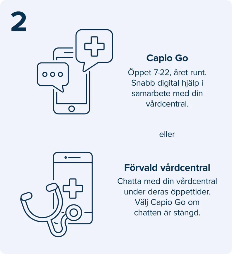 Det ska vara enkelt att komma i kontakt med oss. Digitalt kan du få kontakt med en specifik mottagning eller Capio Go. Capio Go är vår helt digitala mottagning – öppen året runt, även kvällar och helger.