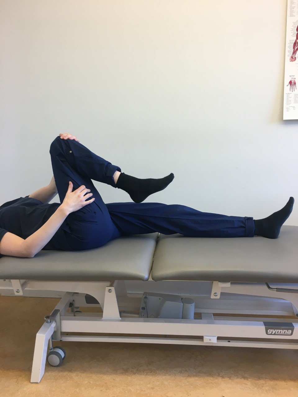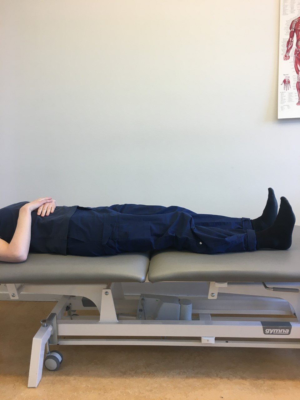 Böj knät maximalt, hjälp till med händerna eller ett skärp. Sträck sedan ut benet och pressa ner knät mot golvet.