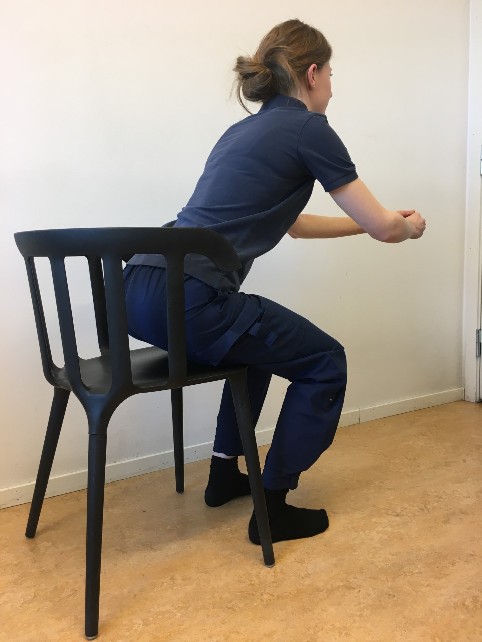 Knäböj så pass långt ner att låren nuddar stolsitsen (undvik att sitta ner helt om det går), och res dig därefter upp igen.