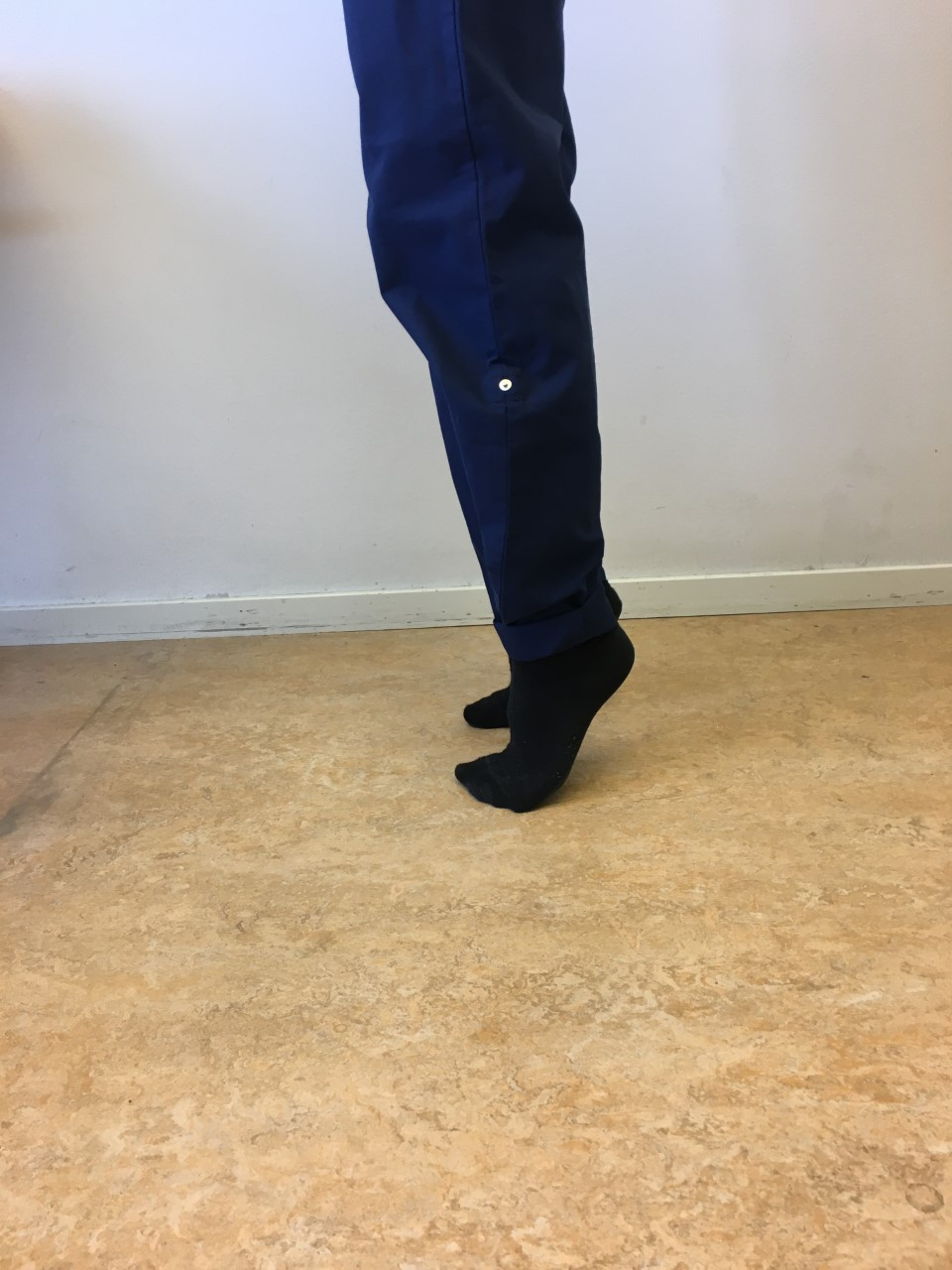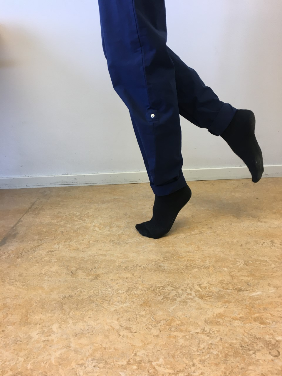 Stå jämfota och håll i något för balansstöd. Pressa dig upp på tå så högt det går och sätt sedan ner hälarna i golvet. Om övningen känns för lätt kan du prova att göra övningen på ett ben i taget som visas i tredje bilden.