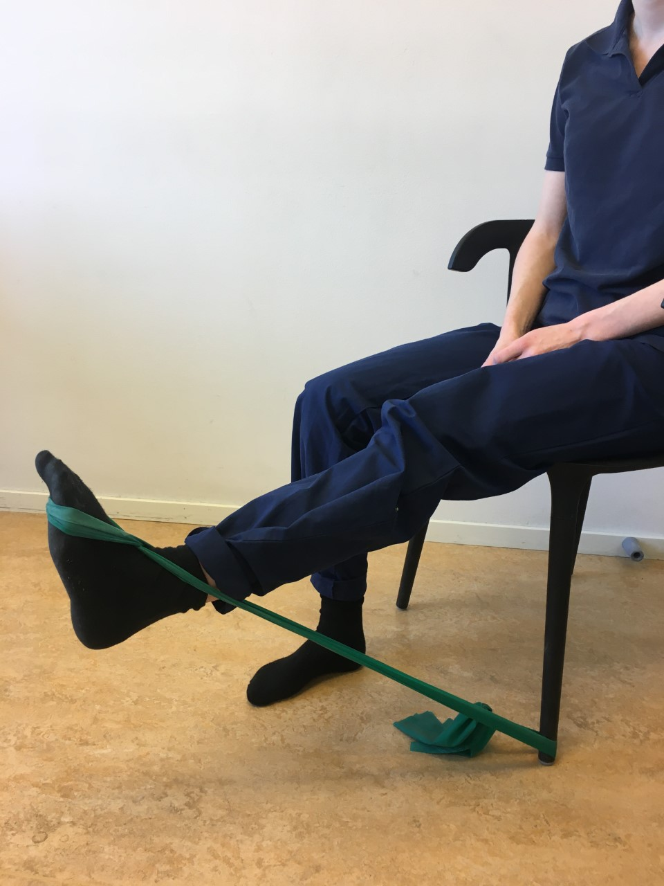 Knyt gummibandet till en ring och fäst det i främre stolsbenet. Placera foten i ringen och lägg en ögla rund framfoten för att hålla bandet på plats. Sträck ut benet maximalt och håll kvar några sekunder innan du lugnt och kontrollerat sätter ner foten i golvet igen.