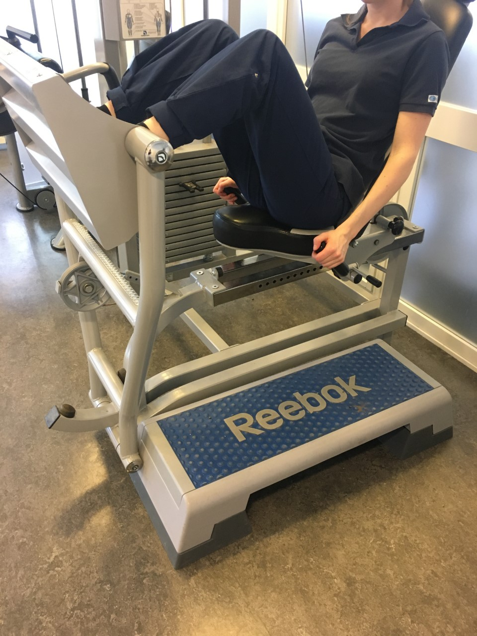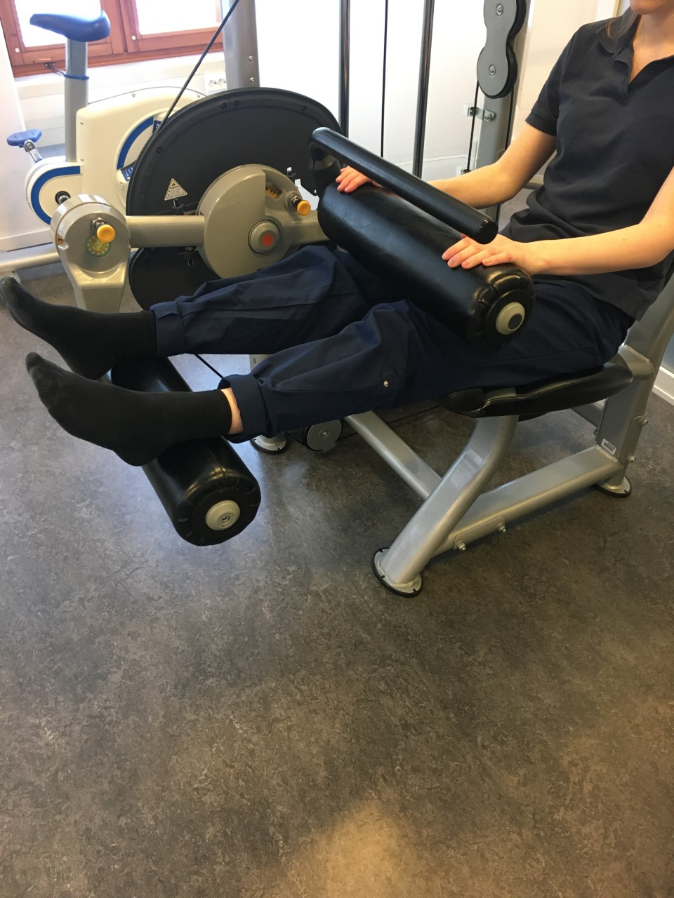 Sitsens framkant ska nudda knävecken utan att trycka obekvämt, placera fötterna framför/ovanpå fotrullen och lägger på passande belastning. Böj benen maximalt och håll kvar några sekunder innan du sträcker ut benen igen.