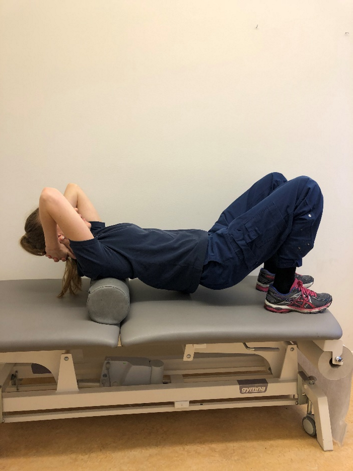 Övning 1: Lägg foamrollern i det smärtande området, lyft upp rumpan med fötterna och rulla fram och tillbaka på rollern.
