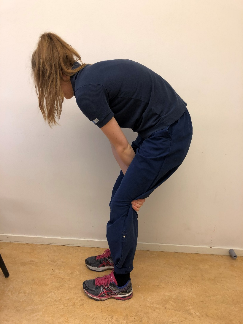Övning 3: Stå eller sitt ned och håll händerna i kors på insidan av låren, pressa bröstryggen uppåt. Töjningen ska kännas i bröstryggen.