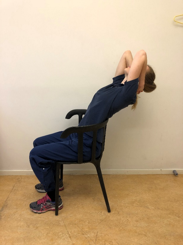 Övning 1: Denna övning kan antingen utföras liggande på foamroller eller sittande på stol, vilket som känns bäst. Ligg på en foamroller eller sitt på en stol med stöd och sätt händerna bakom nacken, ha rumpan i marken och böj dig bakåt över rullen. Ta 10 djupa andetag. Gå upp igen och upprepa 5 gånger.