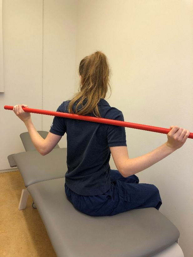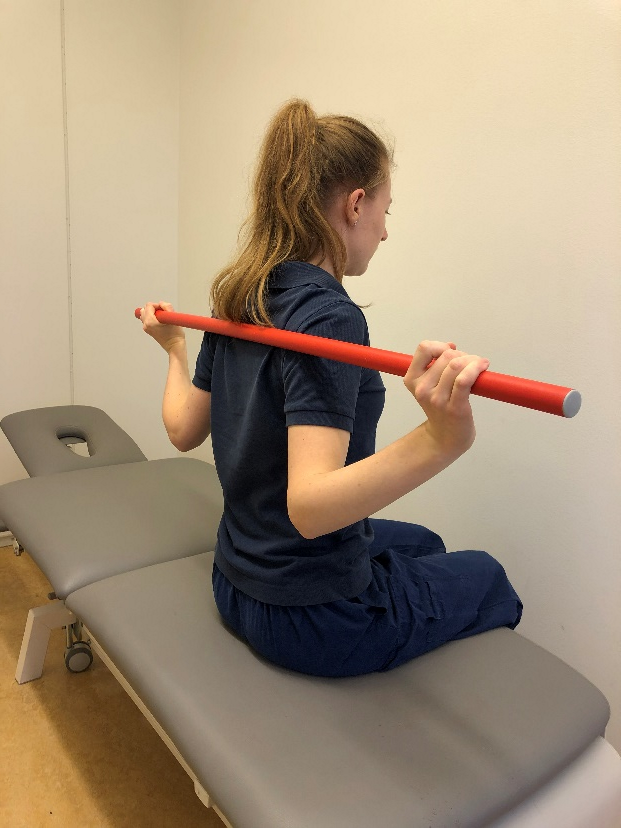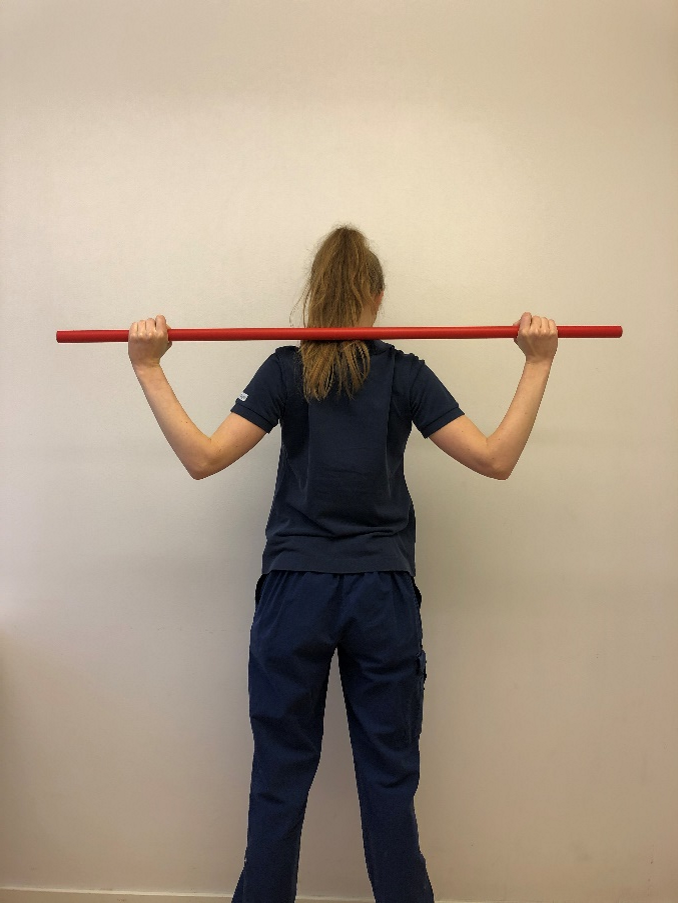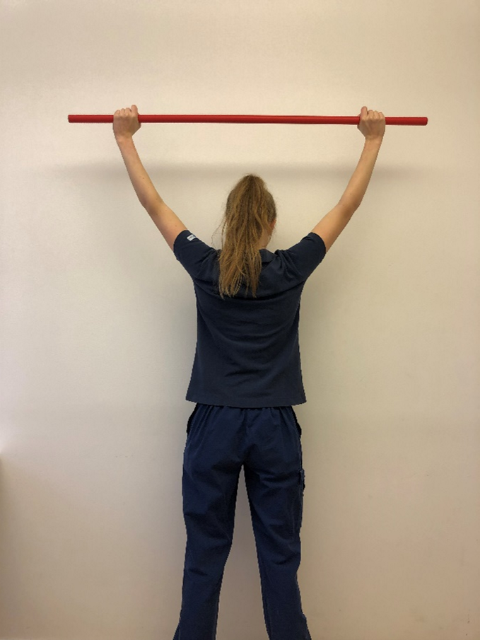 Övning 3: Stå med tårna mot en vägg och håll en pinne bakom ryggen. Sträck armarna rakt upp i luften och för armarna så långt från väggen som möjligt och gå ned bakom ryggen. Upprepa 8x3