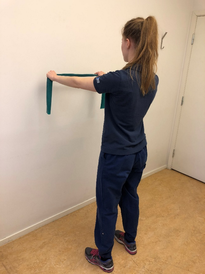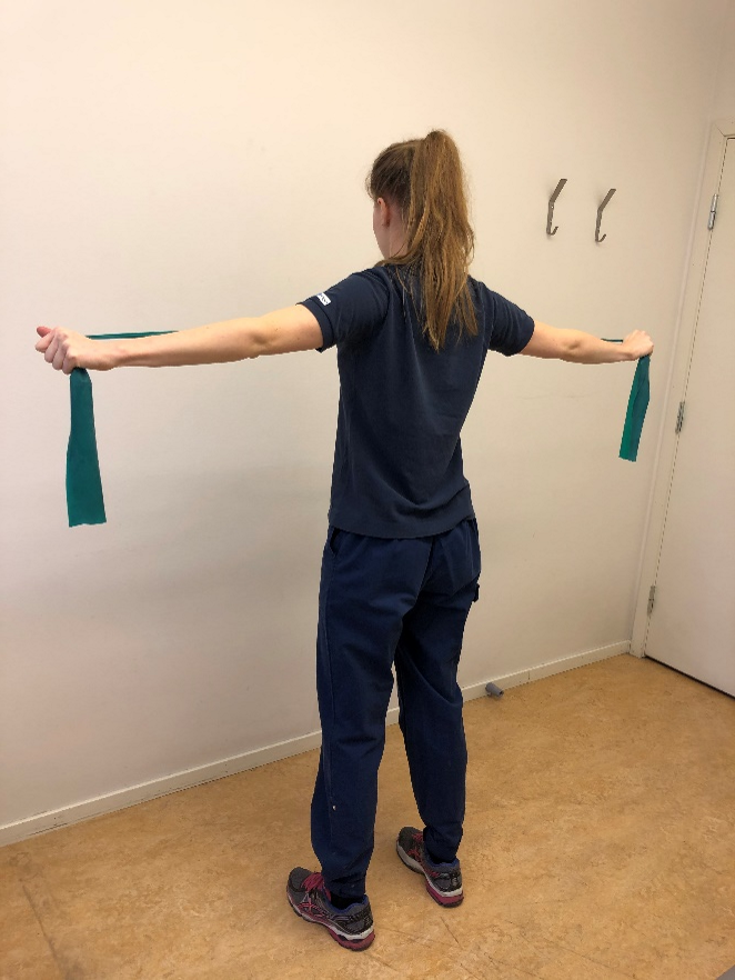 Övning 1: Håll ett gummiband i händerna och dra gummibandet bakåt med böjda armbågar, pressa ihop skulderbladen, bromsa på vägen tillbaka. Upprepa 8x3