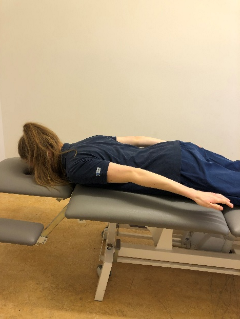 Övning 3: Ligg på mage med armarna rakt bakåt. Lyft upp bröstet något från marken, ha nacken rak. För armarna i luften längs med kroppen tills att de är rakt fram.