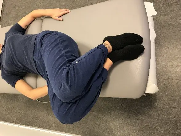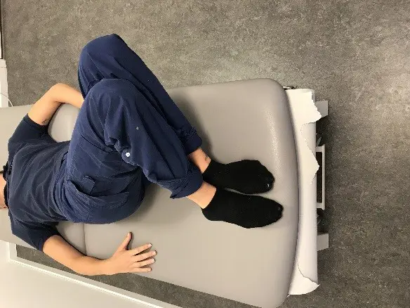 Övning 3: Ligg med axlarna kvar i underlaget, fäll knäna så långt du klarar åt höger och vänster. Upprepa 10 gånger åt varje håll, 5-10 gånger/dag.