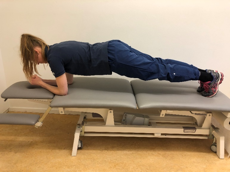 Övning 1: Stå på armbågarna och tårna (eller knäna). Håll ryggen rak och stå kvar i denna position ca 20-30 sekunder, upprepa 3 gånger.