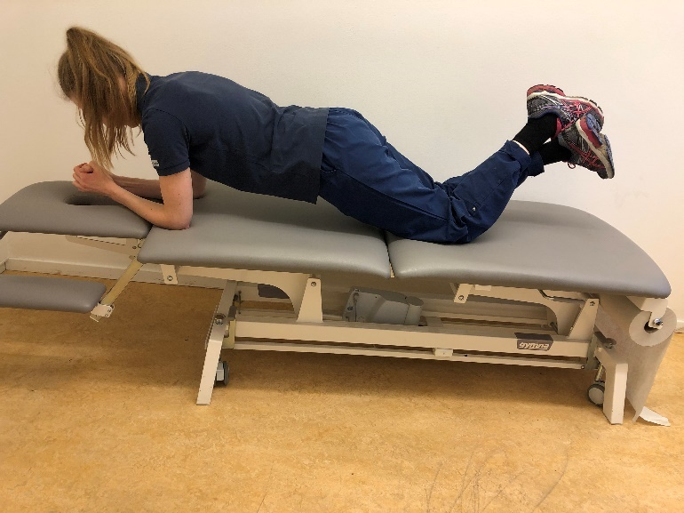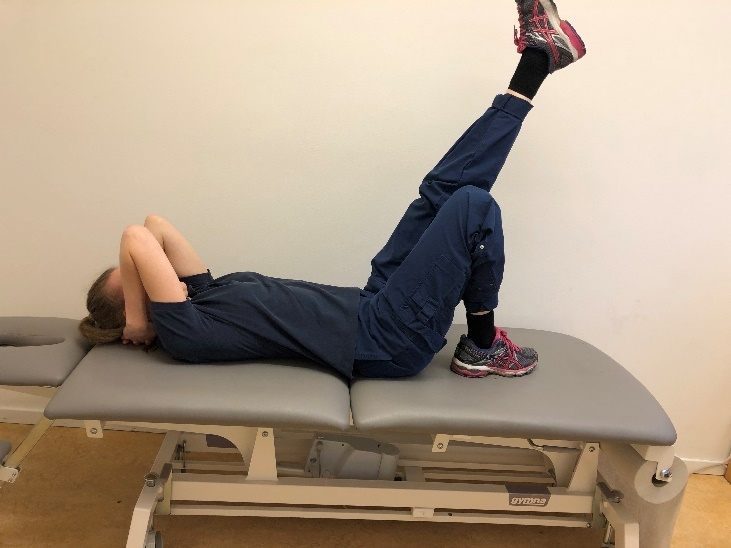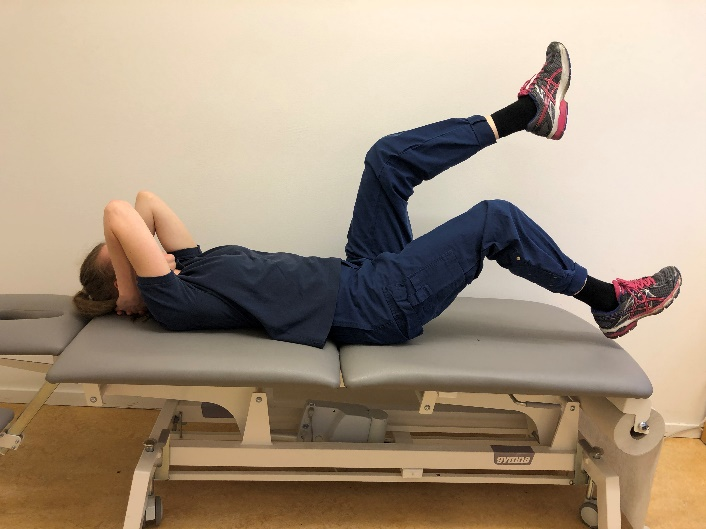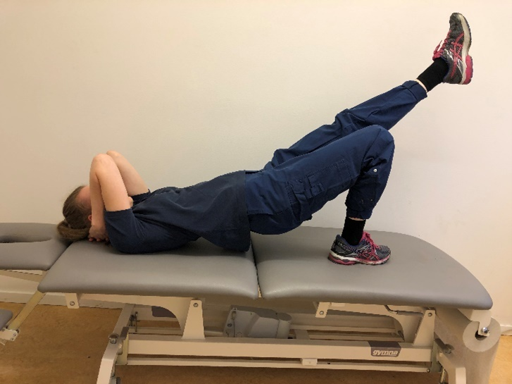 Övning 2: Ligg på rygg och ha ett ben upp i luften (är detta för tungt, ha båda benen i marken), luft upp rumpan och ha knäna i samma höjd under hela rörelsen. Bromsa rörelsen på vägen ned. Upprepa 8x3
