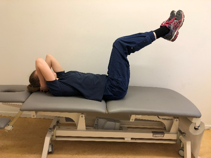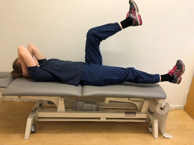 Övning 3: Ligg på rygg och pressa ned svanken mot marken. Ha benen böjda i 90 grader och sträck ut ett ben i taget och doppa hälen i marken. Upprepa 8x3 /ben