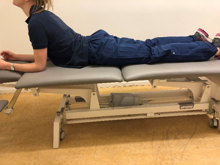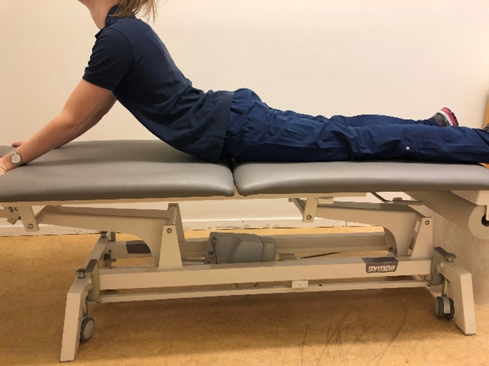 Övning 1: Ligg på mage, sträck armarna upp armarna och böj ryggen bakåt, var kvar i positionen antingen på armbågarna eller med händerna i marken . Ligg kvar med bäckenet i marken. Lyft dig så långt upp det går utan att smärtan triggas. Håll kvar i 1 minut x3