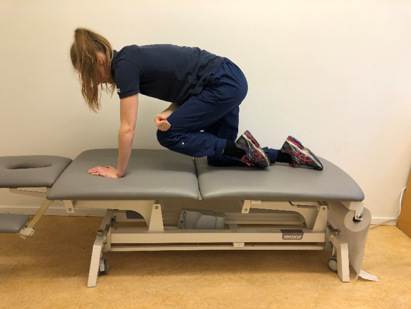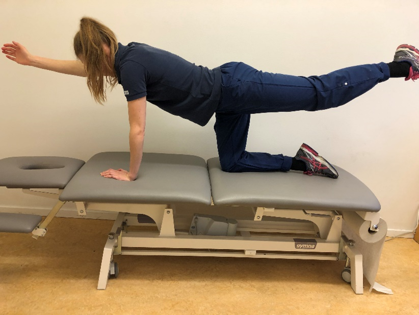 Övning 3: Stå på alla fyra och sträck ut ett ben och en arm diagonalt, upprepa 8x3 och skrifta sedan sida. Försök att hålla ryggen så rak som möjligt.