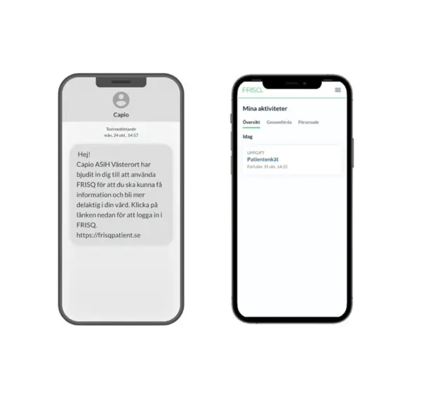 Bilden bredvid visar hur ett sms från Capio med inbjudan till FRISQ kan se ut samt hur det ser ut när man loggat in på FRISQ.