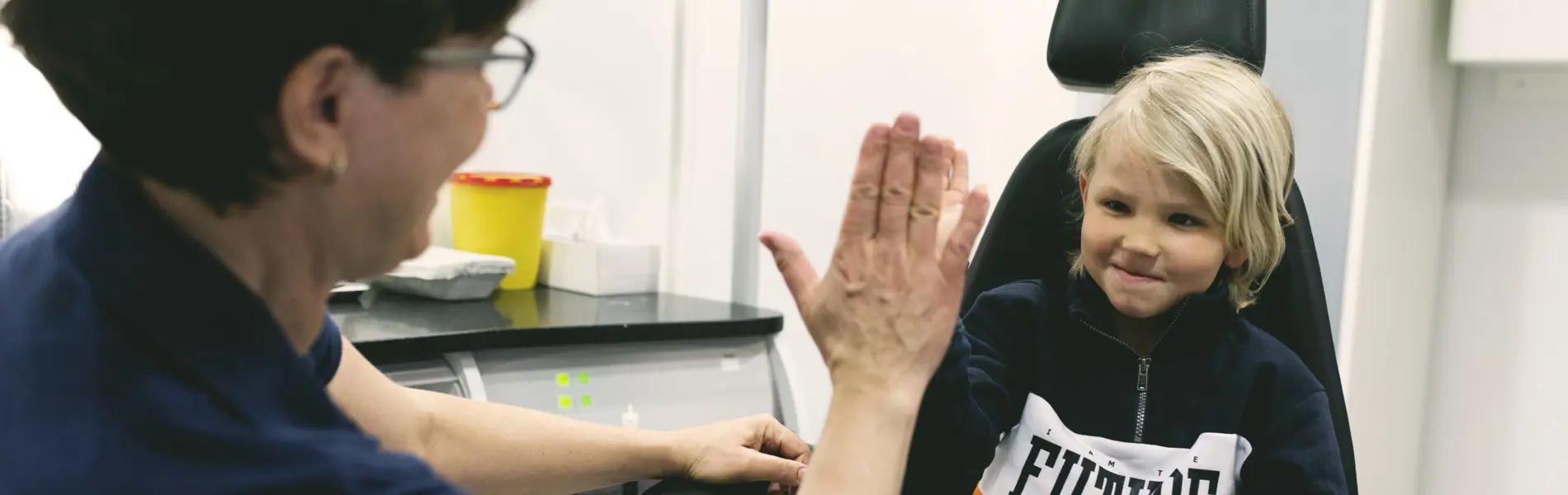 Efter cirka en vecka avlägsnas förbandet på återbesöket på mottagningen. Stygnen i huden försvinner gradvis under två till fyra veckor. Under första månaden efter återbesöket ska barnet ha ett pannband nattetid samt vid kontaktsporter.