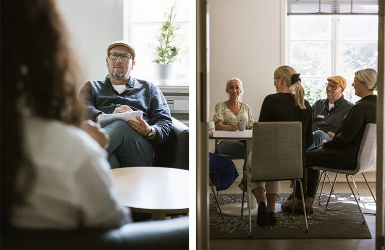 Du behöver vara samarbetsinriktad för att trivas här. Vi jobbar i team tillsammans med patienten. Teamet består av patienten själv, terapeuten, vår doktor och avdelningspersonalen och ska tillsammans bidra till att ha en gemensam bild av problematiken och fatta gemensamma beslut – om nästa steg, hur går vi vidare etc. Eftersom patienten bor på behandlingshemmet tillbringar hen merparten av sina timmar tillsammans med medpatienter och personal på avdelningen. Därför blir samarbetet med andra yrkeskategorier så viktigt, för att vi ska hålla samma röda tråd i arbetet med den enskilde patienten. Avdelningspersonalen är de som stöttar och arbetar med patientens svårigheter i det vardagliga, det som sker på avdelningen exempelvis i samband med måltider eller då patienten kämpar med att stå emot impulser av olika slag. Därför är det viktigt att vi är samspelta och drar åt samma håll.