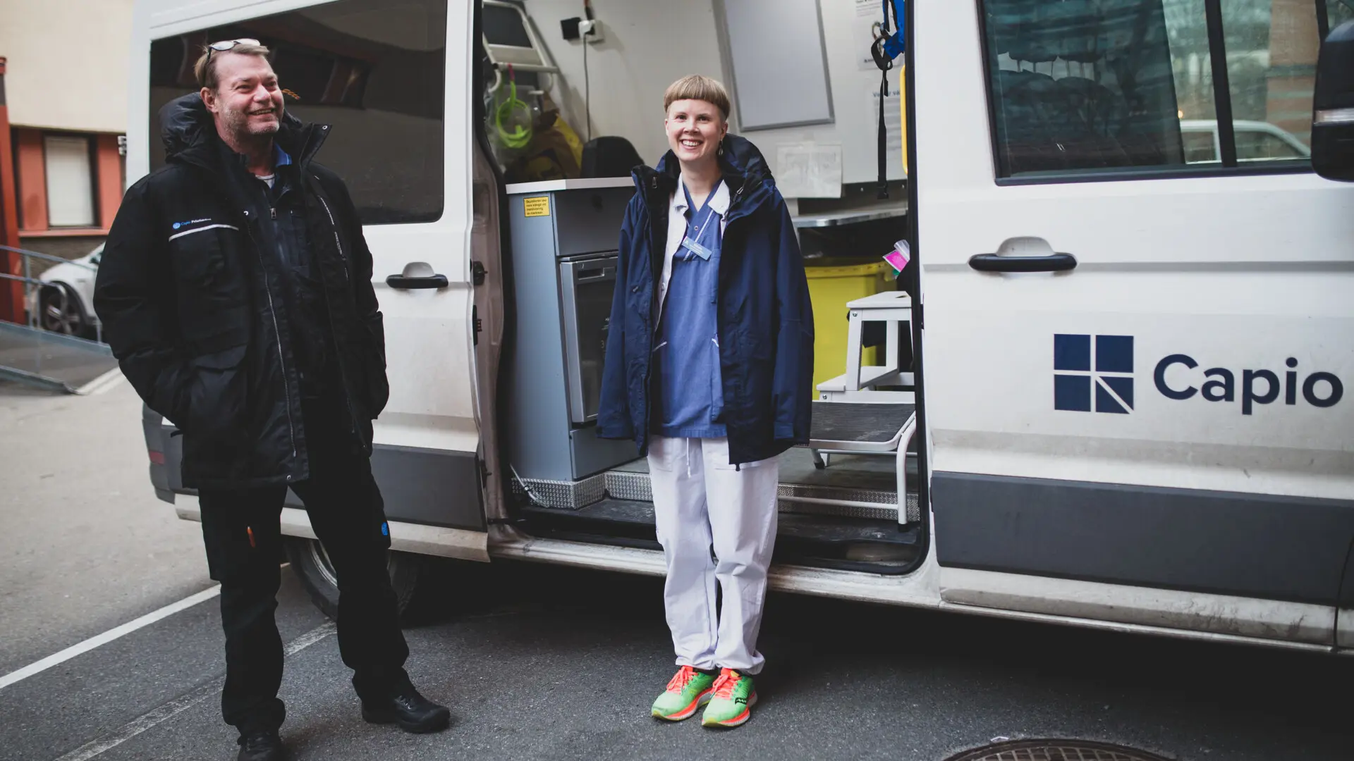 Men alla patienter har inte möjlighet att ta sig till Pelarbacken. Därför jobbar Capio, i samarbete med Beroendecentrums sprututbyte, även med uppsökande verksamhet – en ombyggd skåpbil utrustad som ett behandlingsrum tar sig ut till olika geografiska platser för att möta patienterna där de är. Idag är det sjuksköterskorna Mimmi Deinum och Lars Granelli som åker ut.
