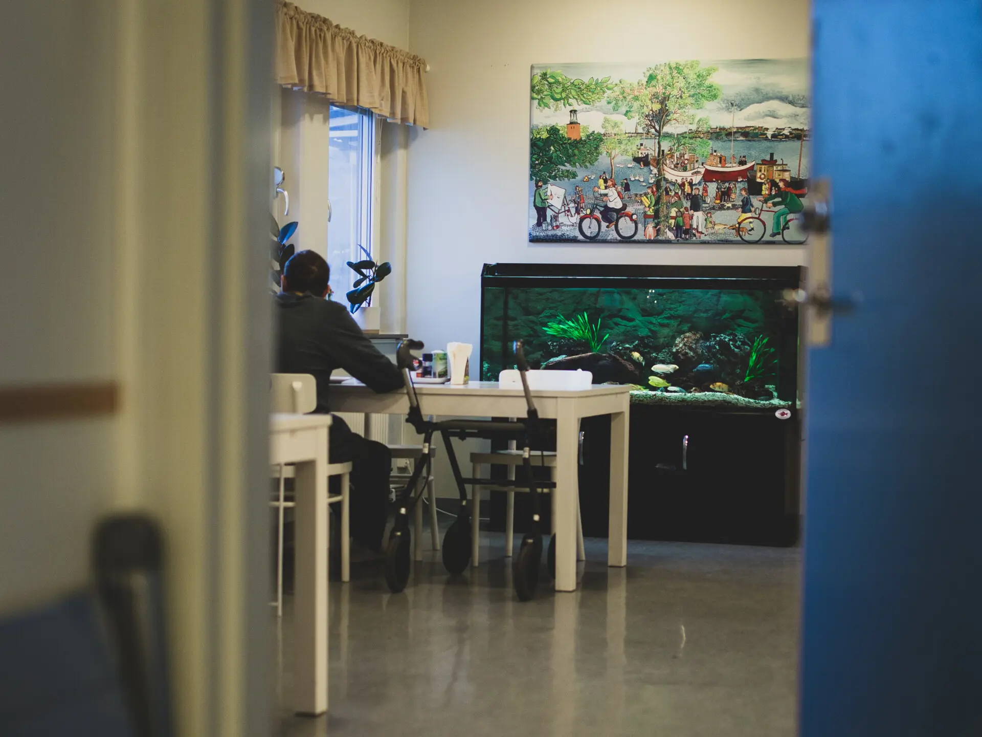 På Capio heldygnsvård i Stockholm finns 14 platser, varav en för palliativ omvårdnad. Hit kommer de som är 18 år eller äldre, när den fortsatta vården inte är lämplig eller möjlig att utföra i hemlöshet. Just nu är det julfint i avdelningens matsal, med adventsljusstakar i fönstren och röda blommor på borden. Det doftar kaffe och stämningen är lugn.