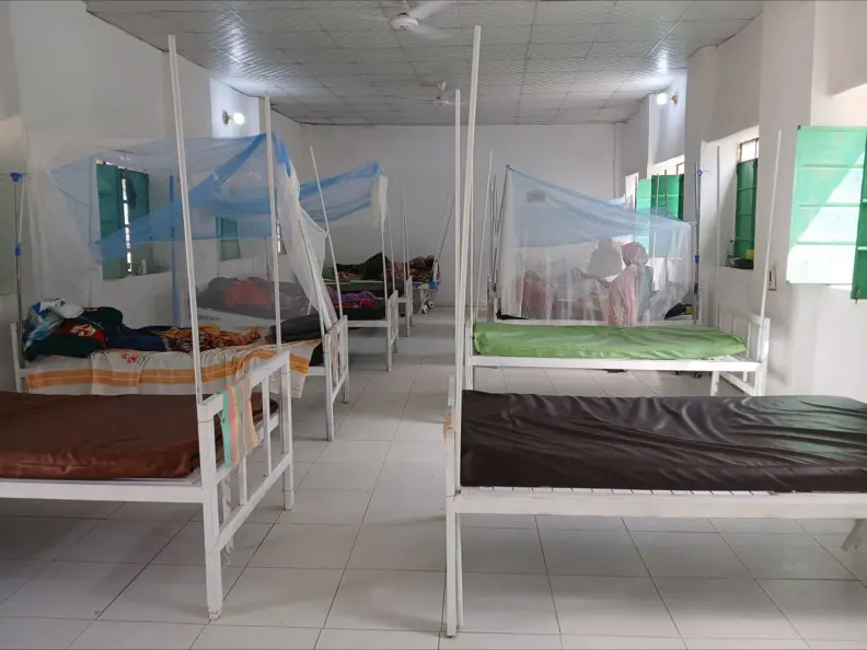 På sjukhuset har vi fyra avdelningar: en för vuxna, en för barn, en förlossning/mödravård och en för att behandla patienter med allvarlig undernäring. Varje avdelning har 10 sängar med galonmadrass och myggnät. På förlossningen och mödravården finns flera rum medan de övriga avdelningarna är en stor sal var. Mitt på området finns ett öppet torg med tak, där medföljande närstående vistas, lagar mat och sover. Många vinkar glatt och ler när jag passerar förbi.