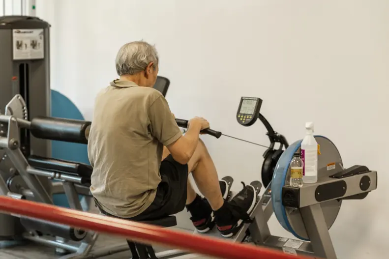 Patienten Leslie Lon bekräftar det fina arbetssättet på vårdcentralen. Han kommer till rehab några dagar i veckan för att träna sjukgymnastik i gymmet som finns i lokalen.
