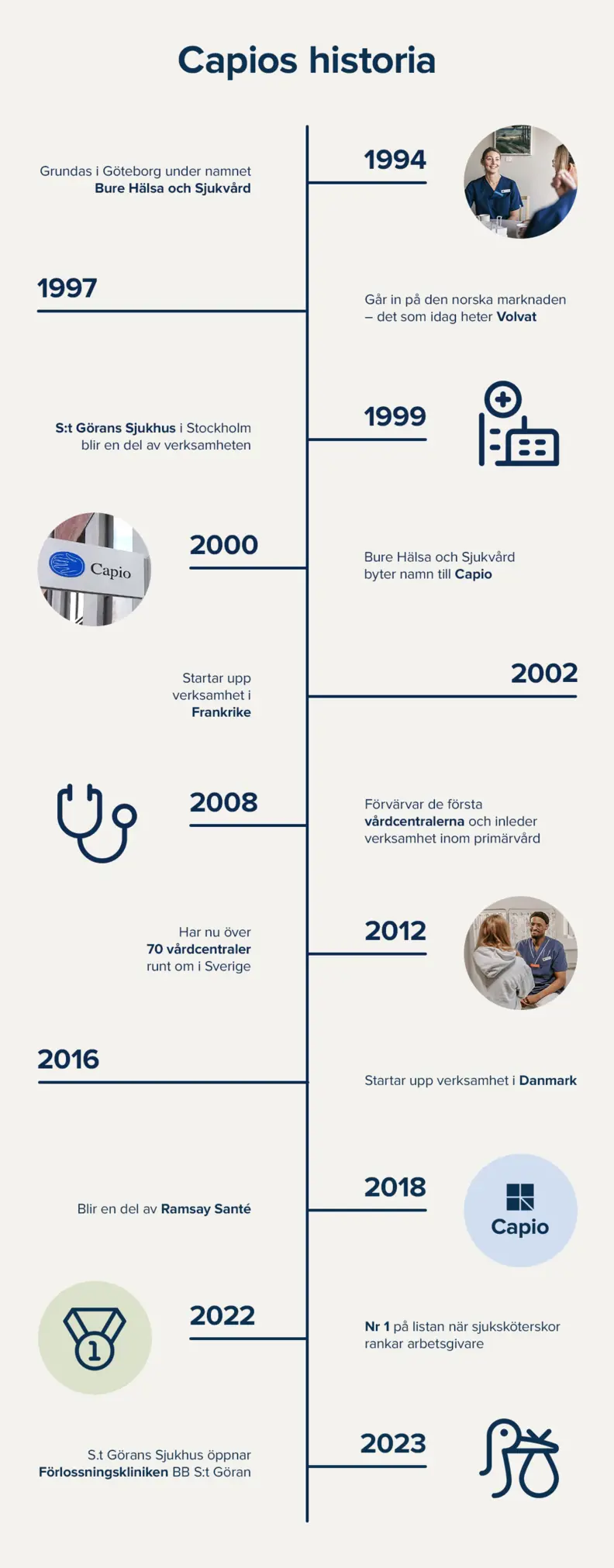 Capio grundades år 1994 under namnet Bure Hälsa och Sjukvård och den första verksamheten som bedrevs var Lundby Sjukhus i Göteborg. I december år 1999 blev S:t Görans Sjukhus i Stockholm en del av vår verksamhet och året därefter bytte Bure Hälsa och Sjukvård namn till Capio.